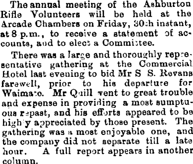 The annual meeting of the Ashburton Rifle Volunteers will be held at the Arcade Chambers on Friday, 30;h instant, at 8 p.m., to receive a statement of accounts, and to elect a Committee. There was a large and thoroughly representative gathering at the Commercial Hotel last evening to bid Mr S S. Revana farewell, prior to his departure for Waimato. Mr Quill vent to great trouble apd expense in providing a moat sumptuoua repast, and his efforts appeared to be high y appreciated by those present. The gathering was u most enjoyable one, and the company did not separate till a late hour, A full report appears in another column.
