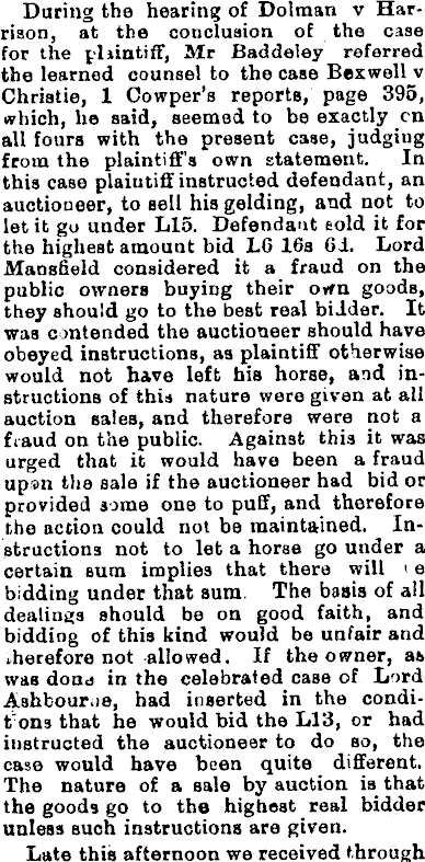 Daring the hearing of Dolman v Harrison, at the conclusion of the case for the (-lain tiff, Mr Bad delay referred the learned counsel to the case Beswell v Christie, 1 Cowper’s reports, page 395, which, he said, seemed to be exactly cn all fours with the present case, judging from the plaintiff's own statement. In this case plaintiff instructed defendant, an auctioneer, to sell his gelding, and not to let it go under LIS. Defendant sold it for the highest amount bid LG 16s 6i. Lord Mansfield considered it a fraud on the public owners buying their own goods, they should go to the best real bidder. It was contended the auctioneer should have obeyed instructions, as plaintiff otherwise would not have left his horse, and instructions of this nature were given at all auction sales, and therefore were not a fraud on the public. Against this it was urged that it would have been a fraud ups>n the sale if the auctioneer had bid or provided some one to puff, and therefore the action could not be maintained. Instructions not to let a horse go under a certain sum implies that there will i e bidding under that sum. The basis of all dealings should be on good faith, and bidding of this kind would be unfair and therefore not -allowed. If the owner, as was done in the celebrated case of Lord Ashbourne, bad inserted in the conditions that he would bid the Ll 3, or had instructed the auctioneer to do so, the case would have been quite different. The nature of a sale by auction that the goods go to the highest real bidder unless such instructions are given. Late this afternoon we received through