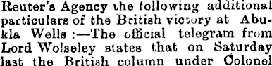 Reuter’s Agency the following additional particulars of the British victory at Abukla Wells :—The official telegram from Lord Wolseley states that on Saturday last the British column under Colonel