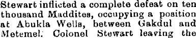 Stewart inflicted a complete defeat on ten thousand Maddites, occupying a position at Abukla Wells, between Cakdul and Metemel. Colonel Stewart leaving the