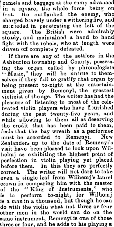 camels and baggage at the camp advanced in a square, the whole force being on f«ot. He outflanked the enemy, who charged bravely under a witheringfire, and succeeded in penetrating the loft of the equate. The British were admirably steady, and maintained a hand to hand fight with the rebels, who at length were driven off completely defeated. If there are any of the settlers in the Ashburton township and County, possessing the organ nailed by phrenologists “ Music,” they will be untrue to themselves if they fail to gratify that organ by being present to-night at the entertainment given by Remenyl, the greatest violinist of the age. The writer has had the pleasure of listening to most of the celebrated violin players who have fljurished during the past twenty-five years, and while allowing to them all as deserving the credit that has been paid to them, feels that the bay wreath as a performer must be accorded to Remenyi. New Zealanders up to the date of Remenyi’s visit have been pleased to look upon Wilhelmj as exhibiting the highest point of perfection in violin playing yet placed before them. In this they are perfectly correct. The writer will not dare to take even a single leaf from Wilhemj’s laurel crown in comparing him with the master of the “ King of Instruments,” who is to perform to-night, for Wilhemj is a man in a thousand, but though he can do with the violin what not three or four other men in the world can do on the same instrument, Remenyi is one of those three or four, and he adds to his playing a