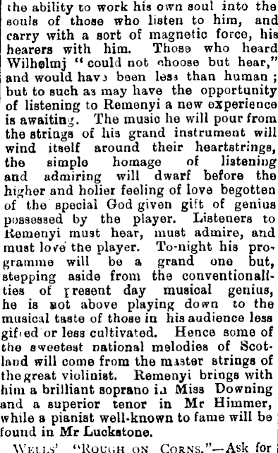 the ability co work his own soul into the souls of those who listen to him, and carry with a sort of magnetic force, his hearers with him. Those who heard Wilhelmj “ could not choose but hear,” and would have been less than human ; but to such as may have the opportunity of listening to Remenyi a new experience is awaiting. The music he will pour from the strings of his grand instrument will wind itself around their heartstrings, the simple homage of listening and admiring will dwarf before the higher and holier feeling of love begotten of the special God given gift of genius possessed by the player. Listeners to Remenyi must hear, must admire, and must love the player. To-night his programme will be a grand one but, stepping aside from the conventionalities of present day musical genius, he is sot above playing down to the musical taste of those in his audience less gified or less cultivated. Hence some of the sweetest national melodies of Scotland will come from the master strings of the great violinist. Remenyi brings with him a brilliant soprano ia Miss Downing and a superior tenor in Mr Himmer, while a pianist well-known to fame will bo found in Mr Luokstone. Wells’ “Rou;h on Corns.”— Ask for