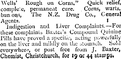 Wells’ Rough on Corns,” Quick relief, complete, permanent cure. , Corns, warts, bun.ogs, The N.Z. Drug Co., General Agents. I indigestion and Inver Complaints.—-For these complaints Baxter’s Compound Quinine Pills have proved a specific, acting powerfully on the liver and mildly on the stomach. Sold everywhere, or post free from J. Baxter, Chemist, Christchurch, for 19 or 44 stamps.
