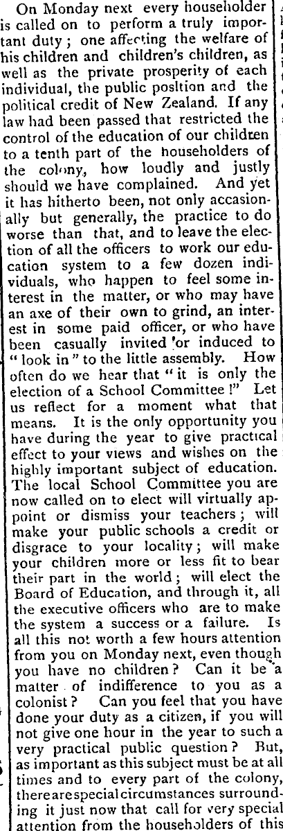 On Monday next every householder is called on to perform a truly important duty ; one affecting the welfare of his children and children’s children, as well as the private prosperity of each individual, the public position and the political credit of New Zealand. If any law had been passed that restricted the control of the education of our children to a tenth part of the householders of the colony, how loudly and justly should we have complained. And yet it has hitherto been, not only accasionally but generally, the practice to do worse than that, and to leave the election of all the officers to work our education system to a few dozen individuals, who happen to feel some interest in the matter, or who may have an axe of their own to grind, an interest in some paid officer, or who have been casually invited 'or induced to “ look in ”to the little assembly. How often do we hear that “it is only the election of a School Committee !” Let us reflect for a moment what that means. It is the only opportunity you have during the year to give practical effect to your views and wishes on the highly important subject of education. The local School Committee you are now called on to elect will virtually appoint or dismiss your teachers; will make your public schools a credit or disgrace to your locality; will make your children more or less fit to bear their part in the world; will elect the Board of Education, and through it, all the executive officers who are to make the system a success or a failure. Is all this not worth a few hours attention from you on Monday next, even though you have no children ? Can it be 'a matter of indifference to you as a colonist ? Can you feel that you have done your duty as a citizen, if you will not give one hour in the year to such a very practical public question ? But, as important as this subject must be at all times and to every part of the colony, therearespecialcircumstances surrounding it just now that call for very special attention from the householders of this