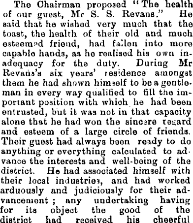 The Chairman proposed “ The health of our guest, Mr S. S. Revana.” He said that he wished very much that the toast, the health of their old and much esteemed friend, had fallen into more capable hands, as he realised his own inadequacy for the duty. During Mr Revahs’s six years’ residence amongst them he had shown himself to be a gentleman in every way qualified to fill the important position with which he had been entrusted, but it was not in that capacity alone that he had won the sincere regard and esteem of a large circle of friends. Their guest had always been ready to do anything or everything calculated to advance the interests and well-being of the district. He had associated himself with their local industries, and had worked arduously and judiciously for their advancement ; any undertaking having for its object the good of the district had received his cheerful