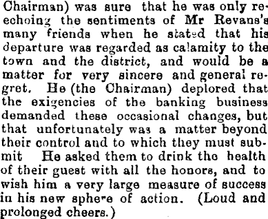 Chairman) was sure that he was only reechoing the sentiments of Mr Revans’s many friends when he stated that his departure was regarded as calamity to the town and the district, and would be a matter for very sincere and general regret, He (the Chairman) deplored that the exigencies of the banking business demanded these occasional changes, but that unfortunately was a matter beyond their control and to which they must submit He asked them to drink the health of their guest with all the honors, and to wish him a very large measure of success in his new sphere of action. (Loud and prolonged cheers.)