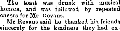 The toast was drunk with musical honors, and was followed by repeated cheers for Mr Kevans. Mr Revans said ha thanked his friends sincerely for the kindness they had ex-