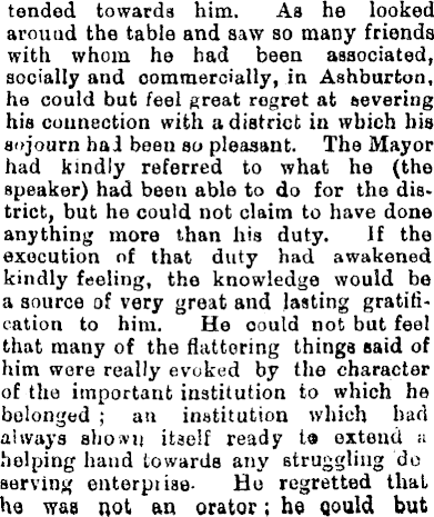 tended towards him. As he looked around the table and saw so many friends with whom he had been associated, socially and commercially, in Ashburton, he could but feel great regret at severing his connection with a district in which bis sojourn had been so pleasant. The Mayor had kindly referred to what he (the speaker) had been able to do for the district, but he could not claim to have done anything more than his duty. If the execution of that duty had awakened kindly feeling, the knowledge would be a source of very great and lasting gratification to him. He could not but feel that many of the flattering things said of him were really evoked by the character of the important institution to which he belonged ; an institution which bad always shown itself ready la extend a helping hand towards any struggling do serving enterpiiae- Ho regretted that he was not an orator; be could but
