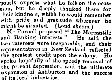 poorly express what he felt oa the occasion, but he deeply thanked them for their kindne o, which he would remember with pride at;d gratitude wherever he might be situated. (Loud cheers.) Mr Purnell proposed “ The Mercantile and Banking interests.” He said the two interests were inseparable, and their representatives in New Zealand reflected the greatest credit upon the colony. He spoke hopefully of the speedy removalof the pn sent depression, and the ultimate expansion of Ashburton and the success of its local industries.