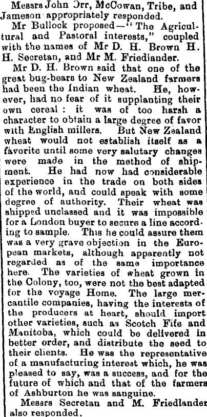 Messrs John Drr, McGowan, Tribe, and Jameson appropriately responded. * Mr Bullock proposed—“ The Agricul- 1 tural and Pastoral interests,” coupled with the names of Mr D. H. Brown H. H. Secretan, and Mr M. Friedlandor. Mr D. H. Brown said that one of the great bug-bears to New Zealand farmers had been the Indian wheat. He, however, had no fear of it supplanting their own cereal : it was of too harsh a character to obtain a largo degree of favor with English millers. But New Zealand wheat would not establish itself as a favorite until some very salutary changes were made in the method of shipment. He had now had considerable experience in the trade on both aides of the world, and could speak with some degree of authority. Their wheat was shipped unclaased and it was impossible for a London buyer to secure a line according to sample. This he could assure them was a very grave objection in the European markets, although apparently not regarded as of the same importance here. The varieties of wheat grown in the Colony, too, were not the best adapted for the voyage Home. The large mercantile companies, having the interests of the producers at heart, should import other varieties, such as Scotch Fife and Manitoba, which could be delivered in better order, and distribute the seed to their clients. He was the representative of a manufacturing interest which, he was pleased to say, was a success, and for the future of which and that of the farmers of Ashburton he was sanguine. Messrs Secretan and M. Friedlander also responded.
