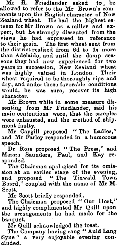 Mr H. Friedlander asked to. be allowed to refer to the Mr Brown’s com ments uponthe English character of New Zealand wheat. He had the highest esteem for Mr Brown as a miller and ex* pert, but he strongly dissented from the views he had expressed In reference to their grain. The first wheat sent from the district realised from fid to Is more than Adelaide, and until the damp sea* sons they had now experienced for two years in succession. New Zealand wheat was highly valued in London. Their wheat required to be thoroughly ripe and dry, and under those favorable conditions would, he was sure, recover its high character. Mr Brown while in some measure dissenting from Mr Friedlander, said his main contentions were, that the samples were exhausted, and the method of shipment faulty. Mr Oaygill proposed “ The Ladies,” and Mr Farley responded in a humorous speech. Dr Ross proposed “ The Press,” and Messrs Saunders, Paul, and Kay responded. The Chairman apologised for its omission at an earlier stage of the evening, and proposed “ The Tinwald Town Board," coupled with the name of Mr M. Scott. Mr Scott briefly responded. The Chairman proposed “ Our Host,” and highly complimented Mr Quill upon the arrangements he had made for the banquet. Mr Quill acknowledged the toast. The Company having sang “ AuldLang Syne ” a very enjoyable evening concluded.