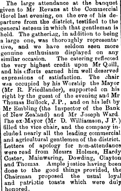 The large attendance at the banquet given to Mr Revans at the Commercial Hotel last evening, on the eve of his departure from the district, testified to the general esteem in which that gentleman is held. The gathering, in addition to being a large one, was thoroughly representative, and we have seldom seen more genuine enthusiasm displayed on any similar occasion. The catering reflected the very highest credit upon Mr Quill, and his efforts earned him well deserved expressions of satisfaction. The chair was occupied by his Worship the Mayor (Mr R. Friedlandor), supported on his right by the guest of the evening and Mr Thomas Bullock, J.P., and on his left by Mr Enabling (the Inspector of the Bank of Hew Zealand) and Mr Joseph Ward. The ex-Mayor (Mr D. Williamson, J P.) filled the vice chair, and the company included nearly all the leading commercial and agricultural gentlemen of the district. Letters of apology for non-attendance were read from Messrs Holmes, Hardy Coster, MaiuWaring, Dowding, Clayton and Thomas, Ample justice having been done to the good things provided, the Chairman proposed the usual loyal and patriotic toasts which were duly honored.