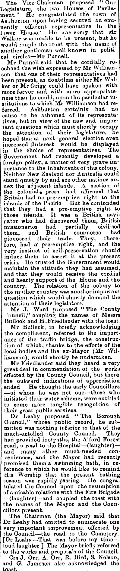The Vice-Chairman proposed “ Our Legislature, the two Houses of Parliament.” He congratulated. the town of As .burton upon having secured an eminently efficient representative iu the lower House.' He was sorry that air VValker was unable to be present, but he would couple the torst with the name of another gentleman well known in politi cal circles —Mr Purnell. Mr Purnell said that he cordially reechoed the wish expressed by Mr Williamson that one of their representatives had been present, as doubtless either Mr Walker or Mr Grigg could have spoken with more fervor and with more appropriateness than he could, upon the particular institutions to which Mr Williamson had referred. Ashburton certainly had no cause to be ashamed of its representatives, but in view of the new and important questions which must shortly occupy the attention of their legislature, he hoped that at next general election even increased [interest would be displayed in the choice of representatives. The Government had recently developed a foreign policy, a matter of very grave importance to the inhabitants of this colony. Neither New Zealand nor Australia could stand quietly by and see other nations annex the adjacent islands. A section of the colonial* press had affirmed that Britain had no pre-emptive right to the islands of the Pacific. But he contended that they had a pre-emptive right to those islands. It was a British navigator who had discovered them, British missionaries had partially civil : sed them, aud British commerce had pioneered their trade. They, therefore, had a - pre-emptive right, and the very instinct of self-preservation should induce them to assert it at the present crisis. He trusted the Government would maintain the attitude they had assumed, and that they would receive the cordial and hearty support of the House and the country. The relation of the colony to the mother country was another important question which would shortly demand the attention of their legislators. Mr J. Ward proposed “The County 'ouncil,” coupling the names of Messrs Bullock and H.Friadlandar with the toast. Mr Bullock, in briefly acknowledging the compliment, referred to the importance of the traffic bridge, the construction of which, thanks to the efforts of the local bodies and the ex-M!ayor (Mr Williamson), would shortly be undertaken. Mr Friedlander said they heard a very great deal in commendation of the works effected by the County Council, but there the outward indications of appreciation ended. He thought the early Councillors —of whom ho was not one—those who initiated their water scheme, were entitled to some more tangible recognition of their great public services. Dr Leahy proposed “ The Borough Council,” whose public record, he submitted was nothing inferior to that of the much-extolled County Council. They had provided footpaths, the Alford Forest road, a road to the Hospital—(laughter)— and many other, much-needed conveniences, and the Mayor had recently promised them a swimming bath, in reference to which he would like to remind His Worship that the present bathing season was rapidly passing. He congratulated the Council upon the resumption of amicable relations with the Fire Brigade —(laughter)—and coupled the toast with the names of the Mayor and the Councillors present. The Chairman (the Mayor) said that Dr Leahy had omitted to enumerate one very important improvement effected by the Council—the road to the Cemetery. [Dr Leahy—That was before my time—loud laughter ] The Mayor briefly referred to the works and propoaa's of the Council. Crs J. Orr, A. Orr, R. Bird, S. Nelson, and G. Jameson also acknowledged the toast.