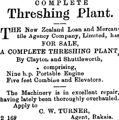 COMPLETE Threshing Plant. THE Hew Zealand Loan and Mercantile Agency Company, Limited, has FOR SALE, A COMPLETE THRESHING PLANT By Clayton and Shuttleworth, . comprising, Nine h.p. Portable Engine Five feet Combine and Elevators. The Machinery is in excellent repair, having lately been thoroughly overhauled. Apply to C. W. TURNER, 2 169 Agent, Bakaia.