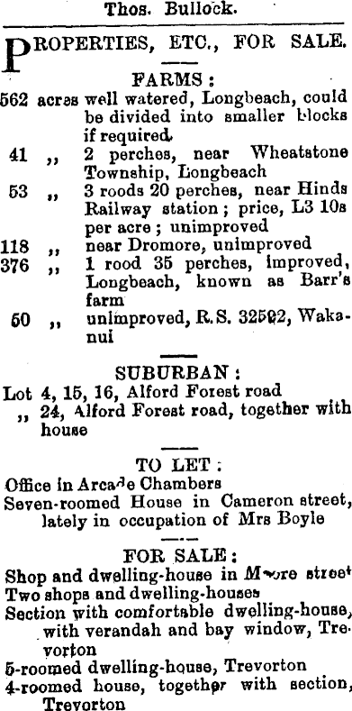 Thos. Bullock. ROPBRTIES, ETC., FOR SALE. 562 acres well watered, Longbeach, coaid be divided into smaller blocks if required. 41 ~ 2 perches, near Wheatstone Township, Longbeach 53 „ 3 roods 20 perches, near Hinds Railway station ; price, L 3 10s per acre; unimproved 118 ~ near Dromore, unimproved 376 ~ 1 rood 35 perches, Improved, Longbeach, known as Barr’s farm 60 ~ unimproved, R.S. 32582, WakaLot 4, 15, 16, Alford Forest road „ 24, Alford Forest road, together with house Office in Arcane Chambers Seven-roomed House in Cameron street, lately in occupation of Mrs Boyle Shop and dwelling-house in stree* Two shops and dwelling-houses Section with comfortable dwelling-house, with verandah and bay window, Troyorton 5-roomed dwelling-house, Treyorton 4-roomed house, together with section, Trevorton FARMS nui SUBURBAN! TO LET ; FOR SALE