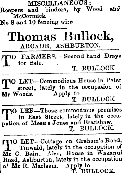 MISCELLANEOUS : Reapers and binders, by Wood and McCormick No 8 and 10 fencing wire Thomas Bullock, ARCADE, ASHBURTON. TO FARMERS. —Second-hand Drays for Sale. T. BULLOCK TO LET—Commodious House in Peter street, lately in the occupation of Mr Woods. Apply to T. BULLOCK TO LEl—Those commodious premises in East Street, lately in the occupation of Messis Jones and Bradshaw. T. BULLOCK. TO LET—Cottage on Graham’s Road, Tinwald, lately in the occupation of Mr C. Bain. Also, House in Wa«canui Road, Ashburton, lately in the occupation of Mr R. Macleam. Apply to T. BULLOCK.
