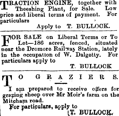 Traction engine, together with Theeahing Plant, for Sale. Low price and liberal terma of payment. For particulara 1 Apply to T. BULLOCK. OR SALE on Liberal Terma or To Let—lß6 acres, fenced, situated near the Dromore Railway Station, lately 1 in the occupation of W. Dalgetty. For I'o GRAZIERS. I ora prepared to receive offers for gracing sheep over Mr Moir’s farm on the Mitcham road. particulars apply to T. BULLOCK For particulars, apply to IT. BULLOCR.
