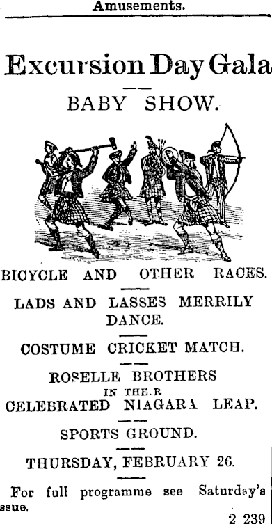 Amusements. Excursion Day Gala BABY SHOW. BICYCLE AND OTHER RACES. LADS AND LASSES MERRILY DANCE. COSTUME CRICKET MATCH. ROSELLE BROTHERS IN XHE R CELEBRATED NIAGARA LEAP. SPORTS GROUND. THURSDAY, FEBRUARY 26. For full programme see Saturday’s issue. 2 239