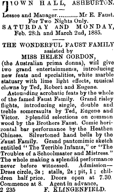 PJIOWN HALL, ASHBURTON. Lessee and Manager Mr E. Faust. For Two Nights Only. SATURDAY AND MONDAY, Feb. 28ih and March 2nd, 1885. THE WONDERFUL FAUST FAMILY assisted by MISS HELEN GORDON, (the Australian pritna donna), will give two grand entertainments, introducing new feats and specialities, white marble statuary with lime light effects, musical clowns by Ted, Robert and Eugene. Astounding acrobatic feats by the whole of the famed Faust Family. Grand risley flights, introducing single, double and treble somersaults by Tod, Eugene and Victor. Splendid selections on common wood by the Brothers Faust. Comic horizontal bar performance by the Heathen Chinese. Silvertoned hand bells by the Faust Family. Grand pantomimic sketch entitled “ The Terrible Infants,’’ or “The Troubles of a Schoolmaster and Mistress. ” The whole making a splendid performance never before witnessed. Admission— Dress circle, 3s ; stalls, 2s ; pit, 1; children half price. Doors open at 7.30. Commence at 8. Agent in advance, 2 235 F. KLINGBNFIBLD.