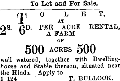 To Let and For Sale. m 0 L E T, J, AX 2S. CD, PER ACRE RENTAL, O A FARM OP 500 acres 500 well watered, together with Dwellinghouse and Stable thereon, situated near the Hinds. Apply to 1 124 T. BULLOCK.
