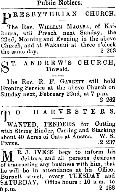 Public Notices; pRESBYTERIAN CHDRCH. The Rev. William Macara, of Kai. koura, will Preach next Sunday, the 22nd, Morning and Evening in the above Church, and at Wakanui at three o’clock the same day. 2 263 ST. ANDREW’S CHURCH, Tinwald. The Rev. R. F. Oakbetx will hold Evening Service at the above Church on Sunday next, February 22nd, at 7 p m. 2 263 rjl O HARVESTERS. WANTED, TENDERS for Cutting with String Binder, Carting and Stacking about 40 Acres of Oats at Anama. W. S. Petek. -2 237 M' R J, IYESS begs to inform his debtors, and all persons desirous of transacting any business with him, that he will be in attendance at his Office, Burnett street, every TUESDAY and SATURDAY. Office hours : 10 a.m. to 6 p.m. 2 188