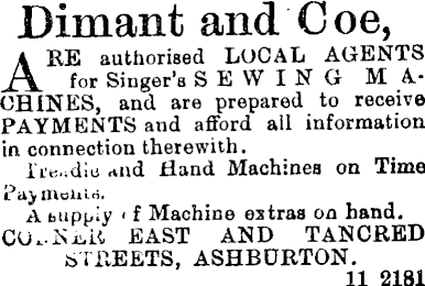 Dimant and Coe, ARE authorised LOCAL AGENTS for Singer’s SEWING M _A* CHINES, and are prepared to receive PAYMENTS and afford ail information in connection therewith. I're.idio and Hand Machines on Time Payments. A buppiy i f Machine estras on hand. CU~Ki.lt EAST AND TANORED STREETS, ASHBDRTON. 11 2181