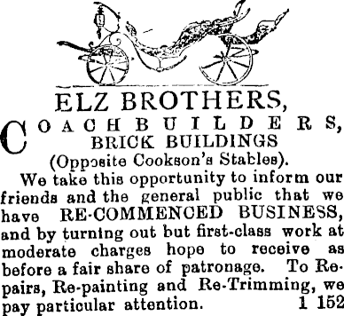 ELZ BROTHERS, Coachbuilde r s, BRICK BUILDINGS (Opposite Cookson’a Stables). We take this opportunity to inform out friends and the general public that we have RE-COMMENCED BUSINESS, and by turning out but first-class work at moderate charges hope to receive as before a fair share of patronage. To Repairs, Re-painting and Re-Trimming, we pay particular attention. 1 152