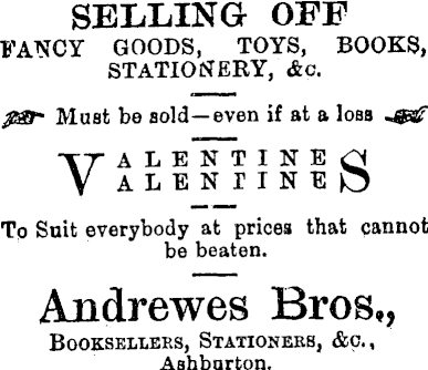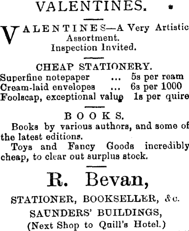 VALENTINES. • VALENTINE S—A Very Artistic Assortment. Inspection Invited. CHEAP STATIONERY. Superfine notepaper ... 5s per ream Cream-laid envelopes ... 6s per 1000 Foolscap, exceptional valup Is per quire BOOKS, Books by various authors, and some of the latest editions. Toys and Fancy Goods incredibly cheap, to clear out surplus stock. B. Bevan, STATIONER, BOOKSELLER, do. SAUNDERS’ BUILDINGS, (Next Shop to Quill’s Hotel.)