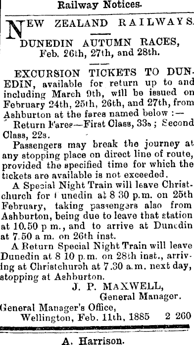 Railway Notices. EW ZEALAND RAILWAYS, DUNEDIN AUTUMN RACES, Feb. 26th, 27th, and 28th. EXCURSION TICKETS TO DUNEDIN, available for return up to and including March 9th, will be issued on February 24th, 25th, 26th, and 27th, from Ashburton at the fares named below : Return Fares—First Class, 33b ; Second Class, 225. Passengers may break the journey at any stopping place on direct line route, provided the specified time for which the tickets are available is not exceeded. A Special Night Train will leave Christchurch for i unedin at 8 30 p.m. on 25th February, taking passengers also from Ashburton, being due to leave that station at 10.50 p m., and to arrive at Dunedin at 7.50 a m. on 26th inst. A Return Special Night Train will leave Dunedin at 8 10 p.m. on 28fch inst., arriving at Christchurch at 7.30 a.m. next day, stopping at Ashburton. General Manager’s Office, Wellington, Feb. 11th, 1885 2 260 jr. p. maxwell, General Manager. A. Harrison.