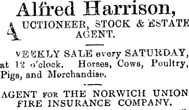 Alfred Harrison, t UCTIONEER, STOCK & ESTATE \ AGENT. V SICKLY SALE every SATURDAY, at 12 o'clock. Horses, Cows, Poultry, Pigs, and Merchandise, AGENT for THE NORWICH UNION FIRE INSURANCE COMPANY.