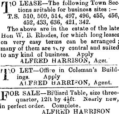 a i,o LEASE—The following Town Sections suitable for business sites : T.S. 510, 509, 514, 497, 496, 455, 456, 452, 433, 636, 421, 342. The above are in the estate of the late Hon W. B. Rhodes, for which long leases on very easy terms can be arranged ; many of them are vtfy central and suited to any kind of business. Apply ALFRED HARRISON, Aget rj',o LET—Offire in Coleman’s BuildJL ings. Apply ALFRED HARRISON, Agent. |7U)R SALE—BiUiard Table, size three'll- quarter, 12ft by 4jrft. iSearly new, in perfect order. Complete. ALFRED HARRISON