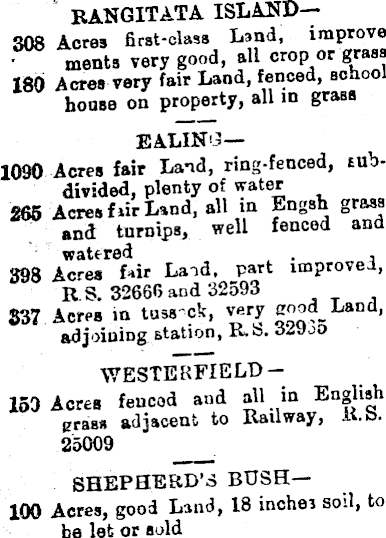 BANGITATA ISLAND--308 Acres first-class Land, improve ments very good, all crop or grass 180 Acres very fair Land, fenced, school house on property, all in grass EALING — 1090 Acres fair Land, ring-fenced, subdivided, plenty of water 265 Acres fair Land, all m Engsh grass and turnips, well fenced and watered , 398 Acres fair Land, part improved, R.S. 32666 and 32093 837 Acres in tussock, very cood_Land, adjoining station, 8.0. otyoo WESTERFIELD 150 Acres fencod and all in En g h ® h (Trass adjacent to Railway, K.b. 25009 SHEPHERD’S BUSH--100 Acres, good Land, 18 inchei soil, to be let or sold