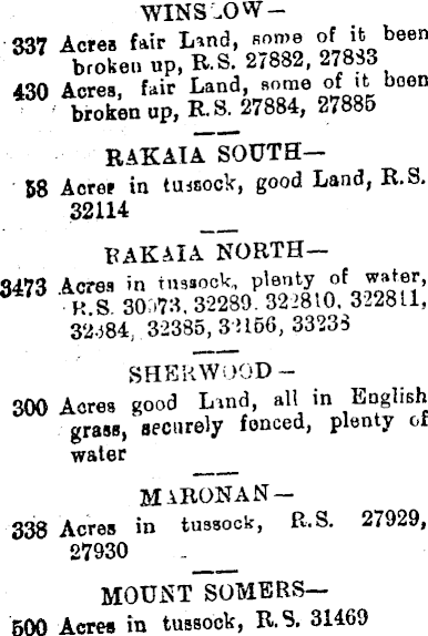 WINS.OW--837 Acres fair Land, Rome of! it been broken up, R.S. 2/882, 27833 430 Acres, fair Land, some of .t been f broken up, R.S. 27884, 27885 RAKAIA SOUTH--58 Acres in tussock, good Land, R.S. 32114 fakaia NORTHqjwq Acres in tussock, plenty of water, 3473 S mm. 32289 322810. 322811, 32484, 32385, 32156, 33233 SHERWOOD--300 Acres good Land, all in English grass, securely fenced, plenty of water MARONAN 338 Acres in tussock, R.S. 27929, 27930 MOUNT SOMERS—--600 Acres in tussock, R.S. 31469