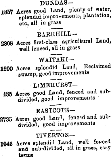 dukdas—--1857 Acres good Land, plenty of water, splendid improvements, plantation, etc, all in grass baerbill—--2808 Acres first-class agricultural Land, well fenced, all in grass WAITAKf — J2OO Acres splendid Land, Reclaimed . swamp, good improvements LIMEHURST—--486 Acres good Land, fenced and subdivided, good improvements EASTCOTE--2736 Acres good Land, fenced and sub* divided, good improvements TIVERTON—--1046 4cres splendid Land, well fenced and sub-divided, all in grass, easy terms