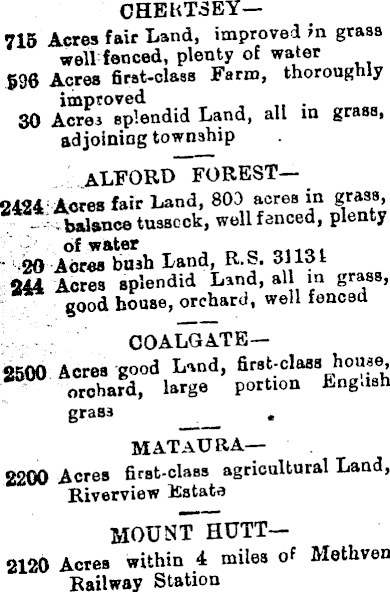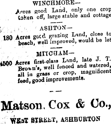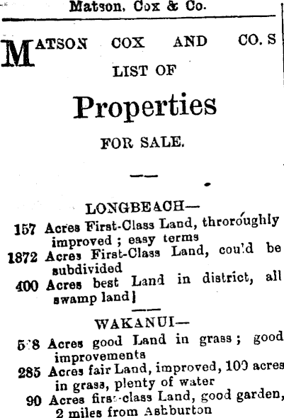 Matson. Con ft Co. TUT ATSON COX AND CO. S ■** LIST OF Properties FOR SALE. LOXGBEAOH— / 157 Acres First-Class Land, thoroughly improved ; easy terms 1872 Acres First-Class Land, cou.d be subdivided 400 Acres best Land m district, all swamp land) WAKANOI—--s’B Acres good Land in grass ; good improvements 285 Acres fair Land, improved, 100 acres in grass, plenty of water 90 Acres firsr-claas Land, good garden, 2 miles from Ashburton