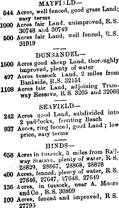 mayfisld—--544 Acres, well fenced, good grass Land; - easy terms j t> c 1000 Acres fair Land, unimproved,-B.b. 30748 and 30749 „ 600 Acres fair Land, well fenced, U.S, 31919 ddnsandel—--1500 Acres good sheep Land, thoroughly improved, plenty of water 'sSJHnd 3 im SEAFI ELD--242 Acres good Land, subdivided into 2 paddocks, fronting Beach 937 Acres, ring fenced, good Land ; low price, easy terms HINDS—--659 Acres in tussock, 5 miles from Radwav Station, plenty of water, R-». 28829, 288G7, 28868, 28828 400 Acres, fenced, plenty of water, K.S. 27646, 27647, 27648, 27649 _ 136 Acres, in tussock, near A. Moore and Co., R.S. 30809 . 100 Acres, fenced and improved, K b. 27795