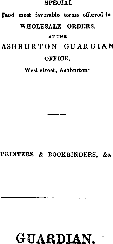 SPECIAL Hand moat favorable terms offerred to WHOLESALE ORDERS. AT TUB ASHBURTON GUARDIAN OFFICE, Weat street, Ashburton* PRINTERS & BOOKBINDERS, &c. GUARDIAN.