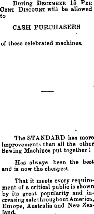 During December 15 Per Cent. Discount will be allowed to CASH PURCHASERS of these celebrated machines. The STANDARD has more improvements than all the other Sewing Machines put together 1 Has always been the best and is now the cheapest. That it meets every requirement of a critical public is shown by its great popularity and increasing sale through out America, Europe, Australia and Now Zealand.