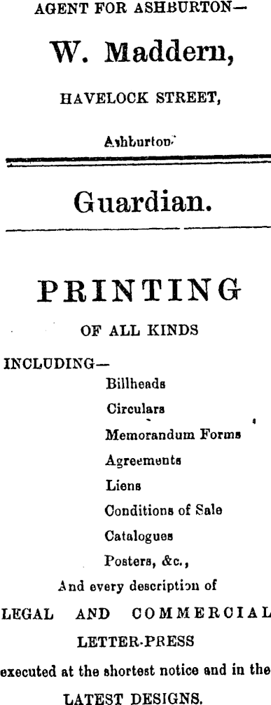 AGENT FOR ASHBURTON— W. Maddem, HAVELOCK STREET, A.ihbnpton>‘ Guardian. PRINTING OP ALL KINDS INCLUDING— Billheads Circulars ' 4 Memorandum Forms Agreements Liens Conditions of Sale Catalogues Posters, &c., A nd every description of LEGAL AND COMMERCIAL LETTERPRESS executed at the shortest notice and in the LATEST DESIGNS.