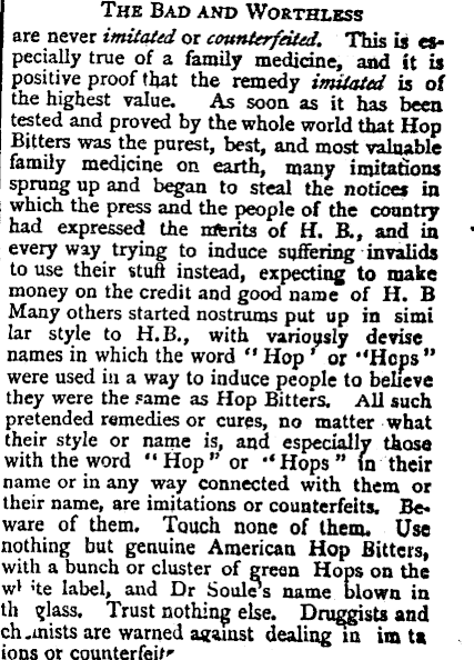 The Bad and Worthless are never imitated or counterfeited. This is especially true of a family medicine, and It is positive proof that the remedy imitated is of the highest value. As soon as it has been tested and proved by the whole world that Hop Bitters was the purest, best, and most valuable family medicine on earth, many imitations sprung up and began to steal the notices in which, the press and the people of the country had expressed the nftrita of H. 8., and in every way trying to induce suffering invalids to use their stud instead, expecting to make money on the credit and good name of H. B Many others started nostrums put up in simi lar style to H. 8., with variously devise names in which the word “ Hop ’ or “Hops ” were used in a way to induce people to believe ! they were the same as Hop Bitters. All such pretended remedies or cures, no matter what their style or name is, and especially those with the word “Hop" or '‘Hops” (n their name or in any way connected with them or their name, are imitations or counterfeits. Beware of them. Touch none of them. Use nothing but genuine American Hop Bitters, with a bunch or cluster of green Hops on the w* >te label, and Dr Soule’s name blown in th glass. Trust nothing else. Druggists and ch .mists are warned against dealingm im ta ions or counterfeit'