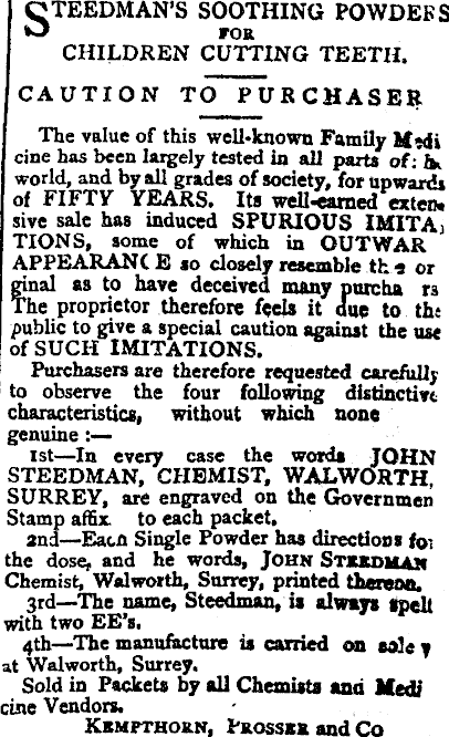 STEEDMAN’S SOOTHING POWDEES FOR CHILDREN CUTTING TEETH. CAUTION TO PURCHASER The value of this welbknown Family MwJi cine has been largely tested in all parts of: i* world, and by all grades of society, for upwards of FIFTY YEARS. Its well-enmed eaten, sive sale has induced SPURIOUS IMITAj TIONS, some of which in OUT WAR APPEARANCE so closely resemble the or ginal as to have deceived many pure ha rs The proprietor therefore feels it one to th« public to give a special caution against the use of SUCH IMITATIONS. Purchasers are therefore requested carefully to observe the four following distinctive characteristics) without which none genuine:— Ist—ln every case the words JOHN STEEDMAN, CHEMIST, WALWORTH, SURREY, are engraved on the Governmen Stamp affix, to each packet. and—Eacn Single Powder has directions fo; the dose, and he words, John Stxrdman Chemist, Walworth, Snrrey, printed thereon. 3rd —The name, Steedman, is always spell with two EE’s. 4th —The manufacture is carried on aale y at Walworth, Surrey. Sold in Packets by all Chemists and jffj) cine Vendors. Kkmpthorn, Prosskr and Co
