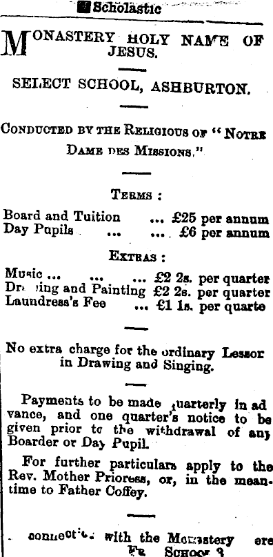 H Scholastic Monastery holy name of JESUS. SELECT SCHOOL, ASHBURTON. Conducted by the Religious or “ Note* Daub t>bs Missions,” Teems Board and Tuition Day Pupils ... £25 per annum . £6 per annum Extras : Mu<«c ... 2a, per quarter Dn ung and Painting £2 2e. per quarter Laundress’s Fee ... £11„. per quarte No extra charge for the ordinary Lessor in Drawing and Singing. Payments to bo made { uarterly in ad vance, and one quarter’s notice to be given prior tc the withdrawal of ani Boarder or Day PupiL For further particulars apply to the Rev. Mother Prioress, or, in the meantime to Father Coffey. connect - **, with the Monastery ere Pa School q