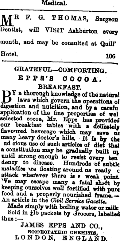Medical. F. G. THOMAS, Surgeon Dentist, will VISIT Ashburton every month, and may be consulted at Quill’ Hotel. log GRATEFUL—COMFORTING. EPPS’S 000 6A. BREAKFAST, BT a thorough knowledge of the natural laws which govern the operations of digestion and nutrition, and by a oarefu application of the fine properties of wel selected cocoa, Mr. Epps has provided our breakfast tables with a delicately flavoured beverage which may save os many heavy doctor’s bills, it is by iiu ad cions use of suck articles of a constitution may be gradually built ui until strong enough to resist every ten dency to disease. Hundreds of subtle maladies are floating around us ready c attack wherever there is » weak, point. ’Ve may escape many a fatal by keeping ourselves well fortified with pure food and a properly nourished frame.— An article in the Civil Service Sozefte. Made simply with boiling water or milkSold in £lb packets by Grocers, labelled thus;— JAMES EPPS AND 00., aOMffiOPATHIO CHEMISTS, 1 LONDON, ENGLAND.