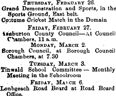 Thursday, February 26. Grand Demonstration and Sports, in the Sports Ground, East belt. Cpitome Cricket Match in the Domain Friday, February 27. ieaburton County Council—At Council Chambers, 11a.m. Monday, March 2. Borough Council, at Borough Council Chambers, at 7.30 Tuesday, March 3. Tihwald School Committee Monthly Meeting in the Schoolroom Friday, Makch 6. Lonbgeach Road Board at Road Board Office.