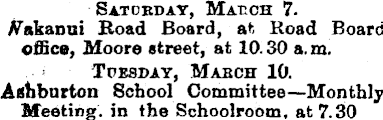 Satoedat, Matich 7. A/akanni Hoad Board, a*-. Road Board office, Moore street, at 10.30 a.m, Toesday, Mabch 10. Ashbnrton School Committee—Monthly Meeting, in the Schoolroom, at 7.30