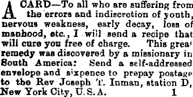 A CARD—To all who are suffering from the errors and indiscretion of youth, nervous weakness, early decay, loss of manhood, etc., I will send a recipe that will cure yon free of charge. This great remedy was discovered by a missionary in South America: Send a self-addressed envelope and sixpence to prepay postage to the Rev Joseph T. Inman, station D, New York City, U. S. A, 1