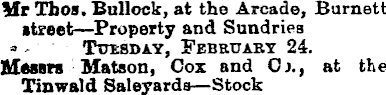 Mr Tfaos, Bullock, at the Arcade, Burnett street—Property and Sundries * - Tuesday, February 24. Messrs Matson, Cox and Cl, at the Tinwald Saleyards— Stock
