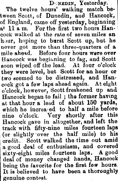 D nkdin, Yesterday. The twelve hours’ walking match between Scott, of Dunedin, and Hancock, of England, came off yesterday, beginning a* 11 a ra. For the first two hours Hancock walked at the rate of seven miles an hour, hoping to burst Scott up, but he never got more than three-quarters of a mile ahead. Before four hours were over Hancock was beginning to fag, and Scott soon wiped off the lead. At four o’clock they were level, but Scott for an hour or two seemed to be distressed, and Hancock got a few laps ahead again. At eight o’clock, however, Scott freshened up and Hancock began to fail ; the former having at that hour a lead of about 150 yards, which he increa-ed to half a mile before nine o’clock. Very shortly after this Hancock gave in altogether, and left the track with fifty-nine miles fourteen laps (or slightly'over the half mile) to his credit. Scott walked the time out amid a good deal of enthusiasm, and covered sixty-eight miles fourteen laps. A good deal of money changed hands, Hancock being the favorite for the first few hours. It is believed to have been a thoroughly genuine contest.