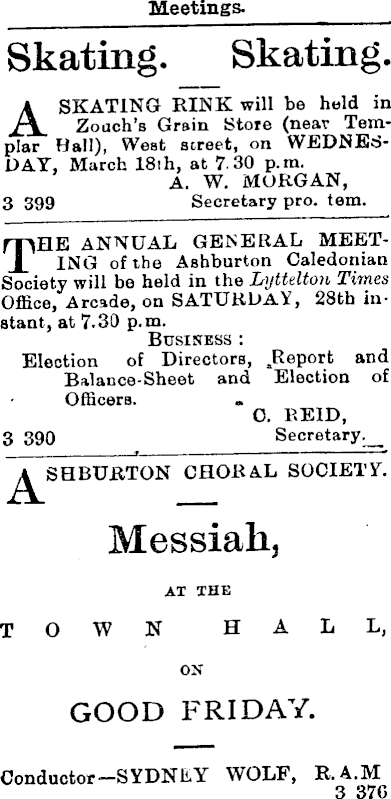Meetings. Skating. Skating. A SKATING RINK will be held in Zouch’s Grain Store (near Templar Hall), West street, on WEDNESDAY, March 18ih, at 7.30 p.m. A. W. MORGAN, 3 399 Secretary pro. tom. THE ANNUAL GENERAL MEETING of the Ashburton Caledonian Society will be held in the Lyttelton Times Office, Arcade, on SATURDAY, 28th instant, at 7.30 p.m. Business : Election of Directors, and Balance-Sheet and Election of Officers. » O. REID, 3 390 Secretary. CHORAL SOCIETY. Messiah, AT THE TOWN HALL, ON GOOD FRIDAY. Conductor —SYDNEY WOLF, R. A.M 3 37G
