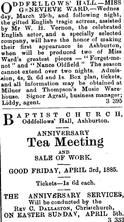ODDFELLOWS’ HALL.—MISS GH.NEYIEVE WARD. —Wednea day, March 25th, and following night, the gifted English tragic actreas, assisted by Mr W. H. Yernon, the celebrated English actor, and a specially selected company, will have the honor of making their first appearance in Ashburton, when will be produced two of Miss Ward’s greatest pieces Forget-me-not ” and “ Nance Oldfield.” The season cannot extend over two nights. Admission, 4s, 2t 6d and Is. Box plan, tickets, and all information may be obtained at Milner and Thompson’s Music Warehouse. Signor Agrati, business manager; Liddy, agent. 3 395 Baptist church, Oddfellows’ Hall, Ashburton. ANNIVERSARY Tea Meeting AND SALS OF WORK. GOOD FRIDAY, APRIL 3rd, 1885. Tickets —Is fid each. THE ANNIVERSARY SERVICES, Will be conducted by the Rev 0. Dailasxon, Christchurch, ON EASTER SUNDAY, APRIL sth.